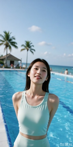 A woman stood by the swimming pool, behind her was a tropical resort that looked like a paradise. The sky was blue and cloudless, and the ocean was vast in the distance. She was wearing a light green sleeveless swimsuit, her long soft hair fluttered in the wind, and she looked at the camera with a faint smile on her face. The soft light reflects the fresh and wonderful colors, creating a dreamy atmosphere. The horizontal viewing angle, the medium shot is composed of three-points, showing the style of vacation photography, the pictures have a soft and blurred effect, HD, bust.