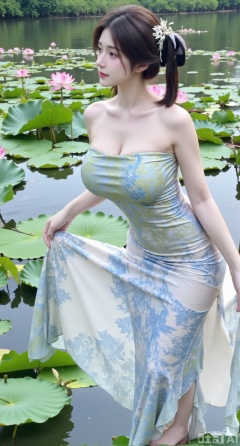(masterpiece,best quality:1.23) A girl with a perfect figure, wearing a blue - and - white - colored strapless slit - printed dress, gently lifting the skirt by the lake in a Jiangnan garden, with lotus leaves and blooming lotus flowers on the lake,,(huge breasts, full breasts:2.98),Xhanfududou,Xsongzhihanfu,Xlujiajia,Xyanqingfei,XfuqingyunY,Xtangqixiongshanqun,Xfeitianhanfu,Xqinghannu,XmeijiX2,XmeijiX,XlingyuyxiuX2,XlingyuyxiuX,Xjianglishenwang,Xjianglishenwang2,Xmoxiongqipao,Xfangjinmoxiong