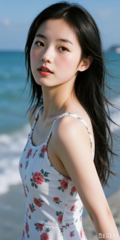 Chinese girl, oval face, ancient style makeup, extremely detailed portrayal, big eyes, lively eyes, delicate appearance, medium-length hair, long hair blown away by the sea breeze, a trace of hanging to her mouth, perfect and slender tall figure, cold white skin, new summer printed suspender dress, fashionable and fashionable outside and inside women's suspender dress, cold makeup, high-quality temperament, charming, sexy and seductive, exaggerated design, dreamy tulle picture with slight flashes at the seaside at night in France, various cute poses, various clothing styles, various hairstyles, HD real master making, HD real person, close-up shot