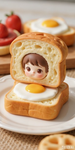 Q-version beautiful complex and exquisite ornaments, handmade DIY texture, soft ceramic material, creatively blends cute dolls with food elements, and embeds baby faces into bread, with novel and interesting image, and combines cute food with cute dolls; rich colors and harmonious combinations, choose natural colors of food, and adds food combinations such as poached eggs, which have strong visual appeal; smooth surface, delicate details, delicate and delicate doll expressions, food textures, etc., and delicate food textures, showing a high level of craftsmanship. Food cute color matching, main view, soft light and shadow