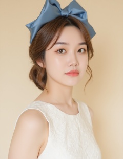 A photograph features a young Asian woman with fair skin and a slender build. She has wavy, light brown hair adorned with a large, satin blue bow. Her makeup is subtle, with a natural look. She wears a white, sleeveless, textured dress with delicate floral patterns. Her expression is calm and serene as she gazes slightly to the side. The background is a plain, light beige, ensuring the focus remains on her. The image has a soft, dreamy quality, emphasizing elegance and innocence.