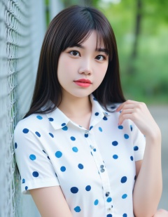 A photograph of a young East Asian woman with straight, long black hair and bangs, wearing a white short-sleeved shirt with blue and dark blue polka dots. She has fair skin, a slim build, and is standing in front of a metal chain-link fence, with greenery visible in the blurred background. Her expression is neutral, and she has a delicate, natural makeup look with red lipstick.