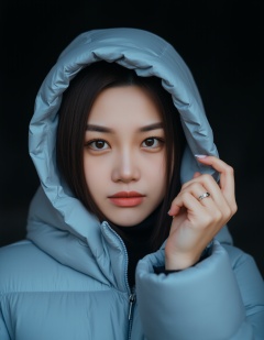 This is a photograph of a young Asian woman with fair skin, dark brown hair, and expressive eyes. She wears a light blue, puffy winter coat with a hood that she holds up with her left hand, revealing a gold ring on her ring finger. The background is dark, emphasizing her face and the texture of the coat. The image captures a sense of mystery and calm.