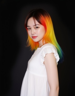 a woman with a rainbow colored hair and a white dress is posing for a picture with a black background and a black background behind her is a black background and a black background with a white and a black background and a white and a white and blue and white background and a black background with a white background and a white and a white and a black and a white and a white image of a woman with a white and a white and a white and a rainbow and a black and a white and a black and a white and a white and a black and a white and a black and a black and a white