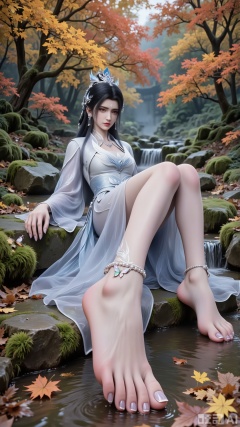 - Action: "Sits sideways against the stone, toes gently touching the water flow below, one hand naturally resting on the stone steps, the other relaxing by the side." Highlight delicate hands and fingers.