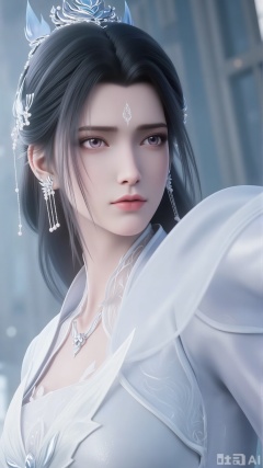 1 beautiful woman, upper body close-up. Long black hair. Hair accessories. forehead. earrings. necklace. White dress. Purple eyes. Beauty contact lenses. eyelash. Fair skin. Wide sleeves. Pure gray background. Light and shadow. Filled with natural light. indoor.