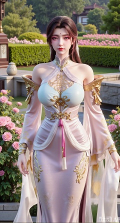 (masterpiece:1.2),best quality,,A woman adorned in traditional Chinese attire,featuring a flowing robe with intricate embroidery and floral accents. A garden filled with pink roses and lush greenery. Soft pastel hues of white,blue,and green,creating a serene atmosphere. Photorealistic photography.,,(huge breasts:2.99),(full breasts:2.99),,XyunxiaoYK,Xsonghanfu,XlingyuyxiuX,XlingyuyxiuX2,Xqinghannu,Xtangqixiongshanqun,XmeijiX2,XmeijiX,XPVCshouban