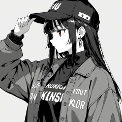 1girl,solo,long hair,monochrome,hat,greyscale,jacket,earrings,jewelry,baseball cap,grey background,upper body,simple background,long sleeves,clothes writing,open clothes,open jacket,closed mouth,bangs,hand on headwear,turtleneck,profile,spot color,sweater,sidelocks,red eyes,
