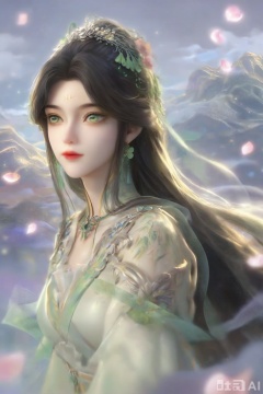Score _9, score _8_up, score _7_up, 1 girl, watching the audience, solo, long hair, black hair, hair accessories, dresses, jewelry, very long hair, green eyes, earrings, white dresses, facial signs, forehead signs, realism, happiness, outdoors, petals, bending over, eating lollipops, lollipops.Mountains, clouds, fog, gilding, crossing gold,hill