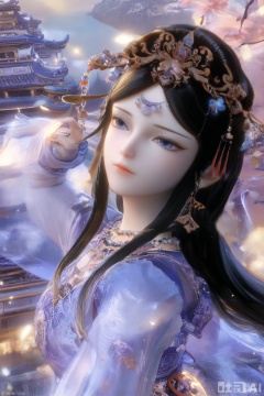 Score_9, score_8_up, score_7_up, looking at the audience, long sleeves, blue theme, necklace, cherry blossoms, petals, 3d, lifelike, ancient architecture, 1 girl, solo, long hair, black hair, hair accessories, long sleeves, dresses, jewelry, necklaces, Hanfu, blue eyes.