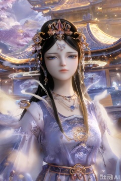 Score_9, score_8_up, score_7_up, looking at the audience, long sleeves, blue theme, necklace, cherry blossoms, petals, 3d, lifelike, ancient architecture, 1 girl, solo, long hair, black hair, hair accessories, long sleeves, dresses, jewelry, necklaces, Hanfu, blue eyes.