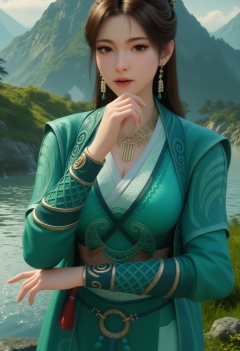 score_9,score_8_up,score_7_up,1girl,solo,long hair,realistic,looking at viewer,shiny_skin,oil,(mature face:1.3),1girl,solo,(big breasts:1.3),(cleavage:1.2),upper body,hanfu,chinese clothes,china dress,dress,green jacket,green skirt,green dress,(long skirt:1.2),long sleeves,green coat,crop top,midriff,coat,cropped shirt,green shirt,cape,champion's tunic (zelda),green footwear,boots,skirt,thigh strap,ribbon,1girl,solo,looking at viewer,jewelry,necklace,hair ornament,hair bun,tassel,tassel earrings,eyelashes,earrings,bracelet,black ribbon,belt,character close-up,brown hair,black eyes,ponytail,collarbone,closed mouth,navel,1girl,pouring,looking up,open mouth,holding,gourd,water,realistic,scenery,mountain,tree,outdoors,sky,cloud,cloudy sky,day,bridge,water,river,fog,<lora:皮肤凹痕:0.3>,<lora:慕沛灵:0.75>,