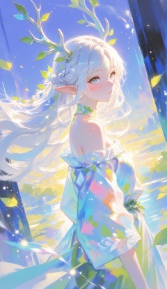 xingmang, glowing,colorful,light particles, glowing particles,painting \(medium\),abstract,masterpiece,absolutely eye-catching,best quality,amazing quality,very aesthetic,absurdres,newest,dynamic pose,dynamic_angle,dutch angle,extreme aesthetic,highres,1girl,solo,long hair,looking at viewer,blush,bangs,bare shoulders,braid,white hair,pointy ears,off shoulder,from side,looking to the side,grey eyes,leaf,facial mark,elf,forehead mark,antlers,