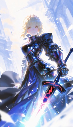 xingmang, glowing,colorful,light particles, glowing particles,painting \(medium\),abstract,(wlop, reoen:0.8025),foreshortening,depth of field,detailed lighting,Volumetric Lighting,(film grain:1.1),kodachrome,masterpiece,best quality,ultra-detailed,newest,very aesthetic,latest,masterpiece,best quality,absurdres,newest,very aesthetic,amazing quality,highres,sensitive,1girl,solo,looking at viewer,short hair,blonde hair,holding,yellow eyes,weapon,sword,holding weapon,armor,holding sword,gauntlets,breastplate,armored dress,black armor,braid,glowing,french braid,visor,Broken armor,Broken visor,dynamic angle,dynamic pose,Dynamic hair,excalibur morgan \(fate\),artoria pendragon \(fate\),saber alter,backlighting,blue and white theme,