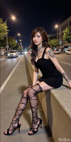 The image shows a woman sitting on a concrete ledge on a city street at night. She is wearing a black dress with lace details and stockings with thigh-high garters. Her long, dark hair is styled, and she has visible tattoos on her arms and legs. She is wearing high-heeled shoes with decorative elements. The background includes a street with moving cars, streetlights, and trees. The overall atmosphere is urban and slightly mysterious due to the night setting and lighting.