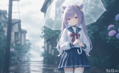 1girl, solo, long hair, looking at viewer, bangs, skirt, shirt, hair ornament, thighhighs, long sleeves, bow, holding, twintails, closed mouth, school uniform, standing, purple eyes, white shirt, purple hair, braid, pleated skirt, outdoors, serafuku, alternate costume, choker, sailor collar, hair bun, blurry, white thighhighs, blue skirt, zettai ryouiki, double bun, umbrella, blue sailor collar, rain, holding umbrella, cone hair bun, transparent, transparent umbrella, keqing \(genshin impact\)
