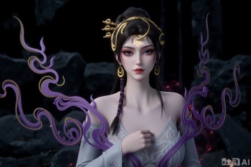 The image depicts a stylized, digitally rendered character with intricate details. The character has long, dark hair styled in an elegant updo, adorned with golden, ornate headpieces that feature swirling patterns. Their face is adorned with subtle makeup, including red lipstick and intricate designs around the eyes. The character is wearing a flowing, light-colored garment with elaborate, swirling patterns in shades of purple and gold. The background is dark and appears to be a rocky or cave-like environment, adding a mystical atmosphere to the scene.,zichu-MJ