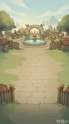 The image is a digital illustration of a beautiful landscape with a stone pathway leading to a small village. The pathway is lined with trees and shrubs, and there are two wooden gates on either side. On the left side of the pathway, there is a small wooden house with a red roof and a chimney, and on the right side, there are several smaller houses with wooden roofs and chimneys. In the center of the image, there appears to be a fountain with a statue of a bird perched on top. The fountain is surrounded by a stone archway and there is an archway in the background. The sky is blue with white clouds, and the mountains can be seen in the distance. The overall color scheme of the illustration is warm and inviting, with shades of green, brown, and yellow.