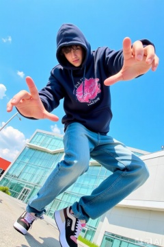 The image features a person wearing a dark blue hoodie with a pink and white graphic design on the front. The person is captured mid-motion, with one hand extended forward and the other arm slightly bent. They are wearing blue jeans and a pair of sneakers with white and pink laces. The background shows a clear blue sky with some clouds and a modern building with large windows. The overall scene appears dynamic and vibrant, with a focus on the person's action and the urban environment.