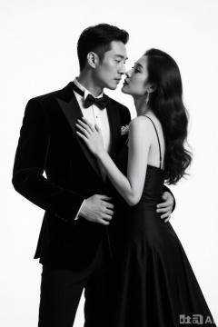 plcp,couple, monochrome, In black - and - white tone, an elegant couple interacts. The man wears a delicate black suit with a bow tie and decorations. The woman wears a black strapless long dress, placing her hand on the man’s chest. They are close intimately. The background is simple white. The composition highlights formal romance. Soft light outlines delicate contours. The style is noble and affectionate, conveying a classic sense of ceremony.