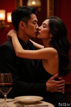 A couple hugged each other tightly, the man was wearing a black suit and the woman was wearing a black backless dress, with a friendly posture. The scene is in the private room of the restaurant with candlelight swaying, with red wine glasses on the table. The style is a warm atmosphere, with candlelight reflecting the cheeks of two people, and the light and shadow intertwined with delicate texture rendering. The colors are mainly dark red and warm yellow, and are low-key and elegant. Composition with a close-up image, focusing on the two people's intertwined arms and their cheeks in front.