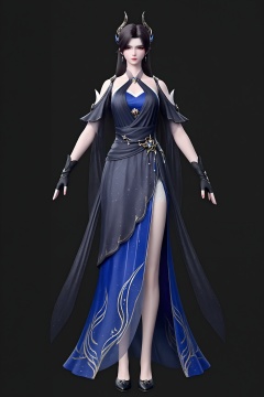 black background,standing,looking at viewer,1girl,cy\(dpcq\),long hair,black hair,hair ornament,jewelry,black hair,shoulder cutout,clothing cutout,blue dress,black dress,bare shoulders,black gloves,fingerless gloves,clothing cutout,black footwear,high heels,