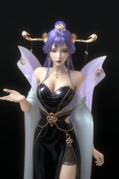 black background,standing,looking at viewer,1girl,tq\(blcs\),long hair,purple hair,hair ornament,breasts,jewelry,hair stick,earrings,purple eyes,necklace,bare shoulders,cleavage,detached sleeves,black dress,black footwear,shawl,