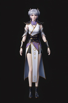 black background,standing,looking at viewer,1girl,hx\(dpcq\),grey hair,hair rings,armor,chinese clothes,low twintails,armor,chinese clothes,white dress,breasts,wrist guards,shoulder armor,sash,pelvic curtain,tassel,sleeveless,,ankle boots,