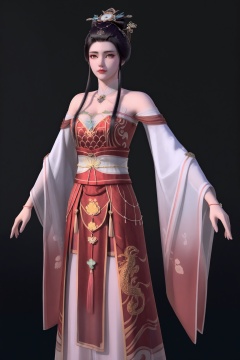 black background,standing,looking at viewer,1girl,bhh\(sngx\),hair ornament,hair bun,black hair,long hair,jewelry,chinese clothes,red dress,long,white sleeves,sash,wide sleeves,see-through,cleavage,bare shoulders,dragon print,tassel,
