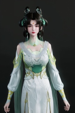 black background,standing,looking at viewer,1girl, cl\(xn\), hair ornament, black hair, hair rings,long hair, forehead mark,earrings, green dress,chinese clothes, white dress, long sleeves,  clothing cutout, shoulder cutout,