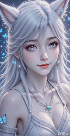 --Role: A woman with white hair, smooth and flowing hair, delicate facial skin, delicate makeup, slender eyelashes, and naturally pink lips. Special effects elements: A large number of blue butterflies surround the characters, some stay on the cheeks and foreheads, some fly between hair, butterfly wings flash with a dreamy luster, and the exquisite starlight effect creates an ethereal atmosphere. posture Facing the camera, the teasing expression and expression were very calm, and there was a hint of longing, giving people a feeling of immersed in beautiful fantasies.