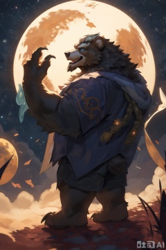 solo, Holding the sun and moon, picking the stars, the sky is filled with stars, the sun and moon shine together, shining brilliantly, with a sense of sacredness and fragmentation, 1boy, full body, furry,male focus, horns, teeth, pants, muscular, light,muscular male, claws, colored sclera,character:Volibear, bear boy,mythical creature, god