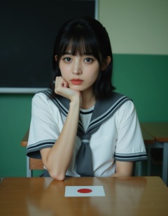 A photograph of a young Asian woman with straight black hair and bangs, sitting at a desk in a classroom. She wears a traditional Japanese schoolgirl uniform: a white blouse with black trim, a grey pleated skirt, and a grey necktie. Her expression is neutral, and she rests her chin on her right hand, which is touching her cheek. The classroom background features green walls and a blackboard on the left. The desk has a Japanese flag sticker. The overall mood is contemplative and slightly melancholic.