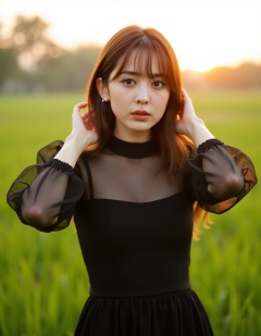 This photograph captures a young Asian woman with fair skin and straight, shoulder-length brown hair. She is standing outdoors in a sunlit field, wearing a sheer black top with puffed sleeves and a black dress underneath. Her expression is neutral, and she is adjusting her hair with both hands. The background features lush greenery and a soft, golden glow from the setting sun, creating a serene, natural ambiance.