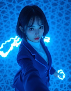 Masterpiece,Top quality,beautiful Korean woman,doll-like face,clean skin,neat deep cobalt blue short cut,bright determined grin,school blazer power suit,blazer seams glowing with blue light,plaid skirt with energy field shimmer,active pose,whipping a glowing energy chain upwards,dynamic arc of blue light in front of her face,intensely saturated monochromatic cobalt blue background,digital grid pattern,POV,high angle,face-focused close-up,looking up at viewer,