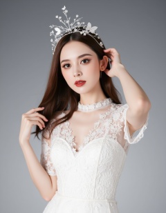 This is a photograph of a young Asian woman with fair skin and long, straight brown hair. She is wearing a white lace dress with intricate floral patterns. Her makeup is bold, featuring red lipstick and dark eye makeup. A delicate, silver headpiece with floral and butterfly motifs adorns her head. She stands against a gradient gray background, with one arm raised, touching her hair. The overall aesthetic is ethereal and elegant, emphasizing her soft features and the texture of the lace fabric.