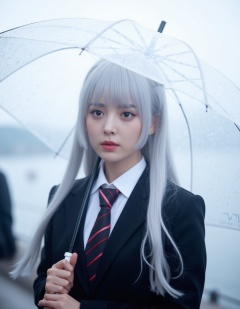 The image shows a person with long,flowing white hair,wearing a dark school uniform with a white shirt and a red-striped tie. They are holding a transparent umbrella,which is slightly open,suggesting they are prepared for rain. The background appears to be an outdoor setting,possibly near a body of water,as there is a blurred view of what looks like a waterfront or a similar area. The lighting is soft and diffused,creating a calm and serene atmosphere.,