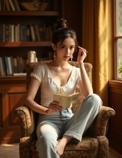 Create a picture of literary and artistic life style, focusing on the characteristics of the characters: bun, white vest, light-colored jeans, sitting posture (hands holding hair, legs crossed), holding a book, and using indoor wooden bookshelves, leisure chairs and warm yellow light and shadow to highlight the delicate texture and leisurely atmosphere of literary and artistic life.