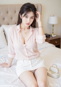 The image shows a woman sitting on a bed, wearing a light pink blouse with a floral pattern and a white skirt. She is accessorized with a necklace and a bracelet. The bed is covered with white bedding, and there is a small white and pearl-like handbag on the bed beside her. The background includes a bedside table and a wall with a light color.