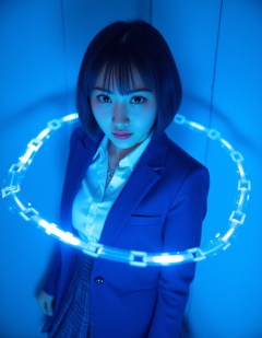 Masterpiece,Top quality,beautiful Korean woman,doll-like face,clean skin,neat deep cobalt blue short cut,bright determined grin,school blazer power suit,blazer seams glowing with blue light,plaid skirt with energy field shimmer,active pose,whipping a glowing energy chain upwards,dynamic arc of blue light in front of her face,intensely saturated monochromatic cobalt blue background,digital grid pattern,POV,high angle,face-focused close-up,looking up at viewer,