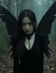 realistic portrait,film style,upper body,Aesthetics of material mourning,illusory and ethereal fairy with black wings,Gothic clothing,the background is the sacred symbol of ideal beauty that is about to disappear,translucent petals drifting with the wind,fluorescent raindrops like broken shadows,a little cold tone,natural hiding color method,complementary color coloring,hazy soft color,warm and glossy,frame composition,like dream,mystery,aestheticism,
