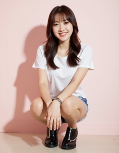a medium-sized Asian woman with long dark brown hair,wearing a white t-shirt and a pair of light blue shorts. She is squatting on the floor with her legs crossed,her hands resting on her knees. She has a smile on her face,and her hair cascades over her shoulders. The woman is wearing a bracelet on her left wrist,and a bracelet in her right hand. She's wearing a pair pair of black leather shoes with a silver chain on the bottom of the shoes. The background is a light pink wall,and the woman's shadow is visible on the left side of the image.,