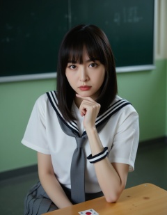 A photograph of a young Asian woman with straight black hair and bangs, sitting at a desk in a classroom. She wears a traditional Japanese schoolgirl uniform: a white blouse with black trim, a grey pleated skirt, and a grey necktie. Her expression is neutral, and she rests her chin on her right hand, which is touching her cheek. The classroom background features green walls and a blackboard on the left. The desk has a Japanese flag sticker. The overall mood is contemplative and slightly melancholic.