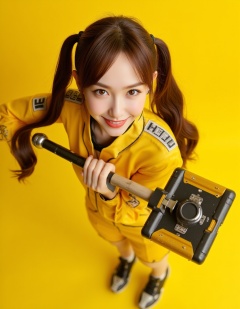 Masterpiece, Top quality, beautiful Korean woman, doll-like face, clean skin, neat honey-brown twintails, bright challenging grin, school jersey-style power suit, armored panels, active pose, giant high-tech warhammer, resting on shoulder, intensely saturated monochromatic citrine-yellow background, POV, high angle, face-focused close-up, looking up at viewer, massive warhammer head, visible behind her, framing face