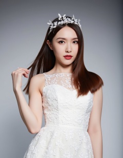 This is a photograph of a young Asian woman with fair skin and long, straight brown hair. She is wearing a white lace dress with intricate floral patterns. Her makeup is bold, featuring red lipstick and dark eye makeup. A delicate, silver headpiece with floral and butterfly motifs adorns her head. She stands against a gradient gray background, with one arm raised, touching her hair. The overall aesthetic is ethereal and elegant, emphasizing her soft features and the texture of the lace fabric.