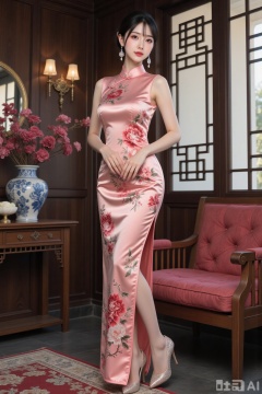 Realistic photo of a young woman with fair skin, big breasts, sleeveless slit silk pattern Chinese cheongsam, long legs, sequin high heels, full body, luxurious Chinese living room, flowers,