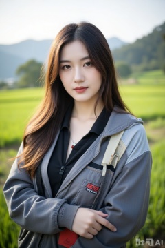 Ultra high resolution, 8k resolution, depth of field, ((realistic portrait)), exquisite facial features, perfect face, female, slightly fat, goddess, single, teacher, lipstick, smile, middle hair, brown hair, bangs, straight hair, necklace, sportswear, jacket, standing, facing viewer, spring, rice fields, flower fields, hills