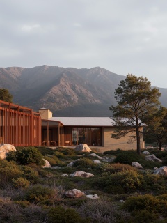 <lora:MIR-v1:0.8>,The image was rendered by the renowned architectural rendering company MIR,This photograph captures a modernist architectural scene set against a mountainous backdrop. Dominating the left side is a building with a red and brown grid-like facade, reflecting the surrounding light. To the right, a large, minimalist structure with vertical lines and a beige hue stands out. The structures are set in a clearing with sparse vegetation, including a tree with sparse leaves in the foreground. The sky is overcast with clouds, casting a diffused light over the scene. The foreground has a mix of green shrubs and small trees, adding texture and depth. The overall composition juxtaposes the geometric precision of the buildings with the natural, rugged mountain in the background. The photograph has a calm, serene atmosphere, emphasizing the contrast between man-made structures and nature. The lighting suggests late afternoon or early evening, with soft shadows and warm tones., mir_rendering style,, cutting-edge design, futuristic aesthetics, intricate details, ultra-high-definition textures, dynamic lighting, realistic materials, professional-grade visualization, immersive and engaging environments, showcasing innovation and precision, advanced rendering techniques, 4k resolution, volumetric effects, captivating visuals, Through the glass, indoor details can be seen, transparent glass, smooth glass texture, light reflection presentation, (warm indoor lighting: 1.3), high transparency makes the interior bright and transparent, and the internal scene is clearly visible,