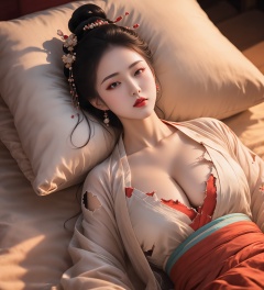 1girl,jewelry,red_lips_,water red lips,drop earrings,eye makeup,black hair,(solo:1.3),outdoors,outdoor,plump breasts,chest,cleavage,light particles,sparkle,glowing,<lora:汉服眼妆1.3:0.4>,male_focus,pillow,<lora:破烂汉服躺着1.1:0.8>,tattered hanfu,