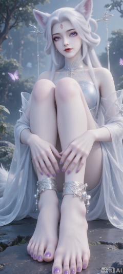 Tip: Masterpiece, best quality, super fine, centered on a fox-eared girl, barefoot, wearing purple nail polish, sitting on a stone, platinum hair with pink highlights, big fox ears (pink inside), purple eyes, fantasy dress (light blue + gold pattern, off-shoulder, pink gold shoulder armor), misty forest background, soft natural light, 3D anime rendering, movie-grade composition, 8K